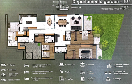 SALA, COMEDOR, COCINA EQUIPADA TODO TERMINADO EN MÁRMOL, Y MADERA DE NOGAL VISTA A ZONA VERDE, 2 LUGARES DE ESTACIONAMIENTO, BODEGA