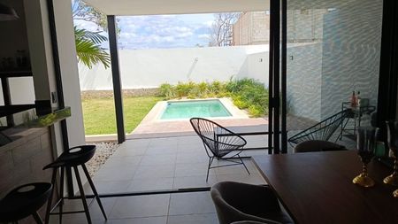 *Equipamiento: Gavetas inferiores y repisas en cocina (madera de pino y caovilla), tanque estacionario de 120lt, boiler eléctrico, Cochera Techada, Mosquitero y Alberca (2.5 x 4.8) con acabado Chukum